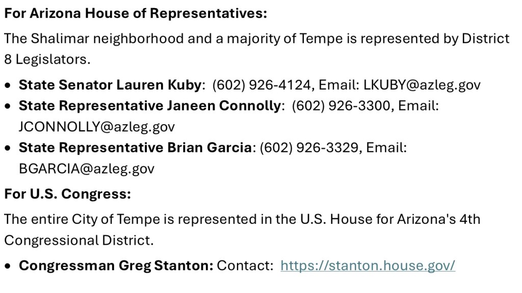 Tempe City Council election in March/May 2026 – It is important to know your candidate’s position on Shalimar. Ask questions. Get clear and unambiguous answers. Shalimar is a voter issue. Save Shalimar has provided feedback from both incumbents and candidates for office. This feedback will be ‘refreshed’ ahead of the election. The Tempe City Council will decide by vote on any rezoning.